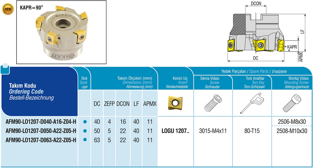 AKKO Eckmesserkopf ø 40 mm, 90° Anstellwinkel, kompatibel mit Mitsubishi LOGU 1207..