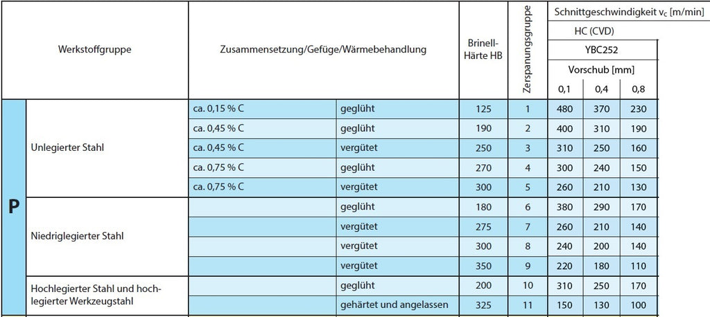 Einsatzbereich von HM-Sorte YBC252 | Geeignet für mittlere Bearbeitung bis Schruppen von Stahl und Stahlguss. Optimierte Eigenschaft von Verschleißfestigkeit und Zähigkeit für einen breiten Anwendungsbereich. | |