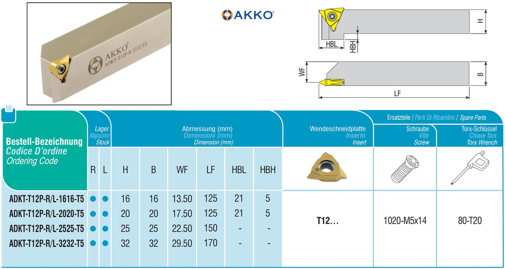 ADKT-T12P-L-3232-T5 AKKO Poly-V-Drehhalter 32 mm x 32 mm, kompatibel mit AKKO-Wendeplatte T12…