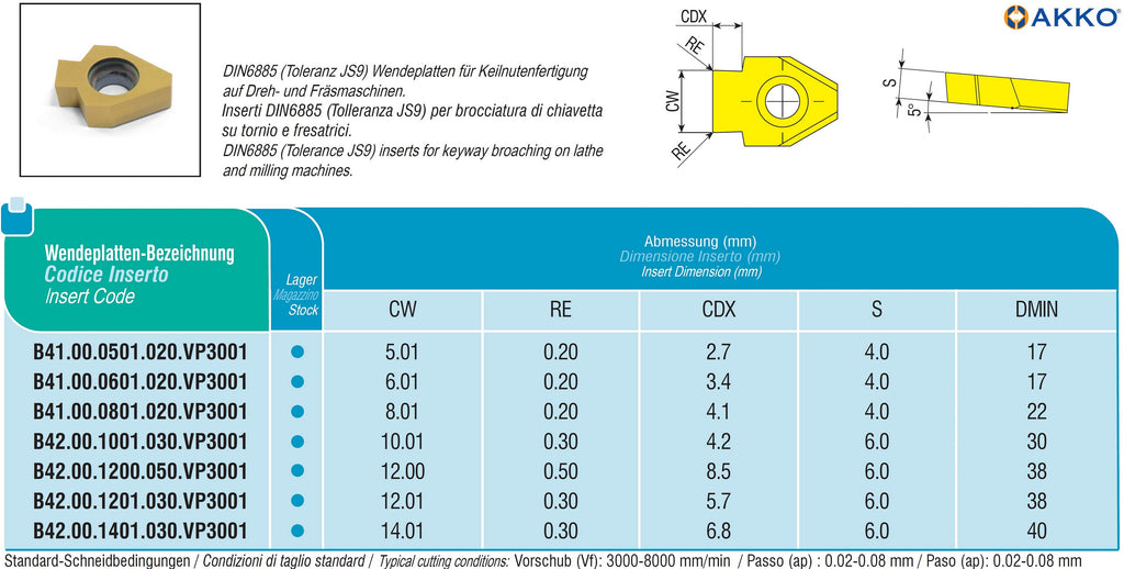 AKKO Wendeplatte für Keilnutenfertigung, Nutbreite CW = 14.01 mm, Nuttiefe CDX = 6.8 mm, Eckenradius RE = 0.30 mm