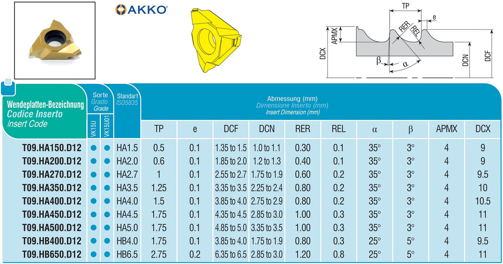 AKKO Wendeplatte zum Gewindewirbeln, Steigung TP = 1 mm, α = 35°
